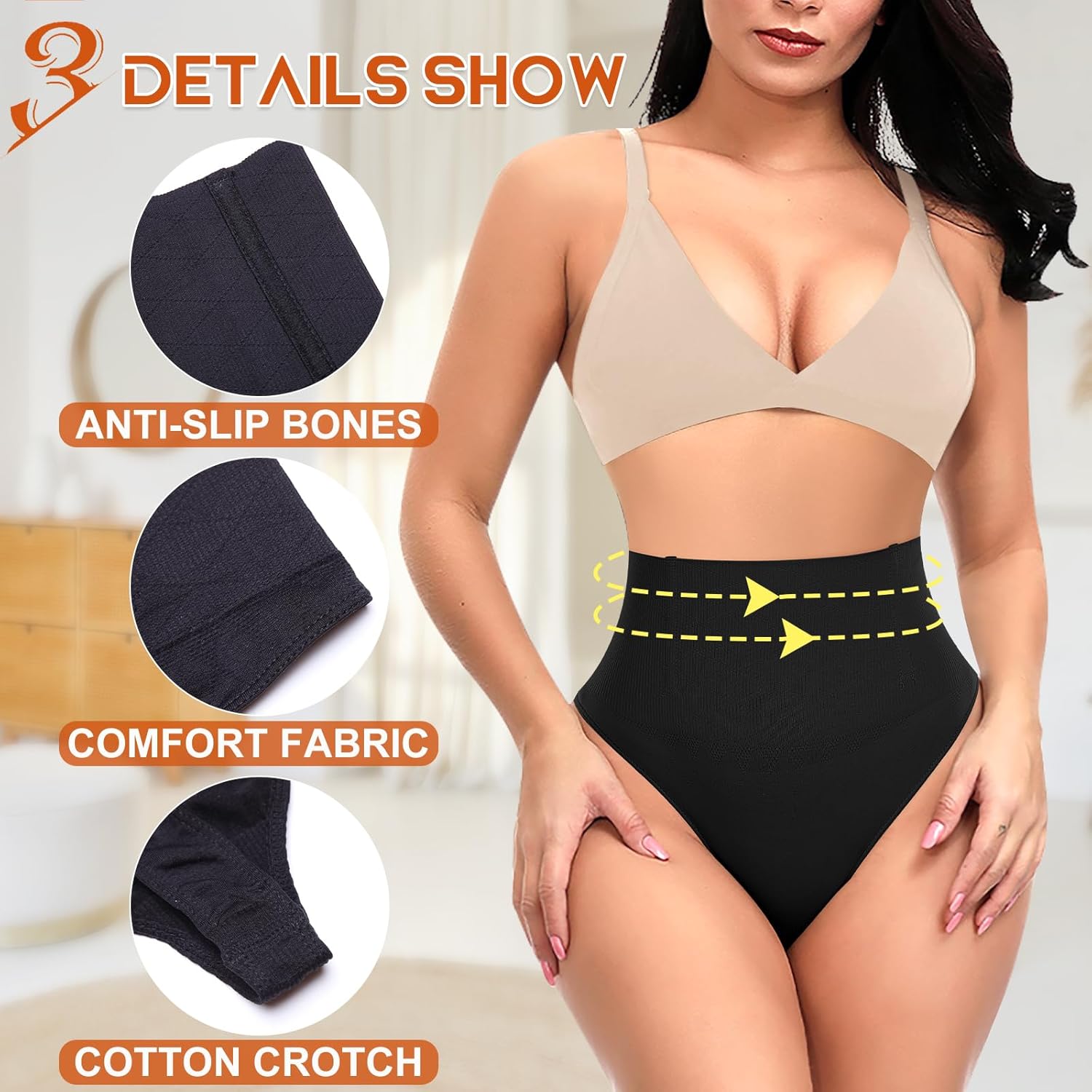 Design: High-waist shaping thong with seamless edges