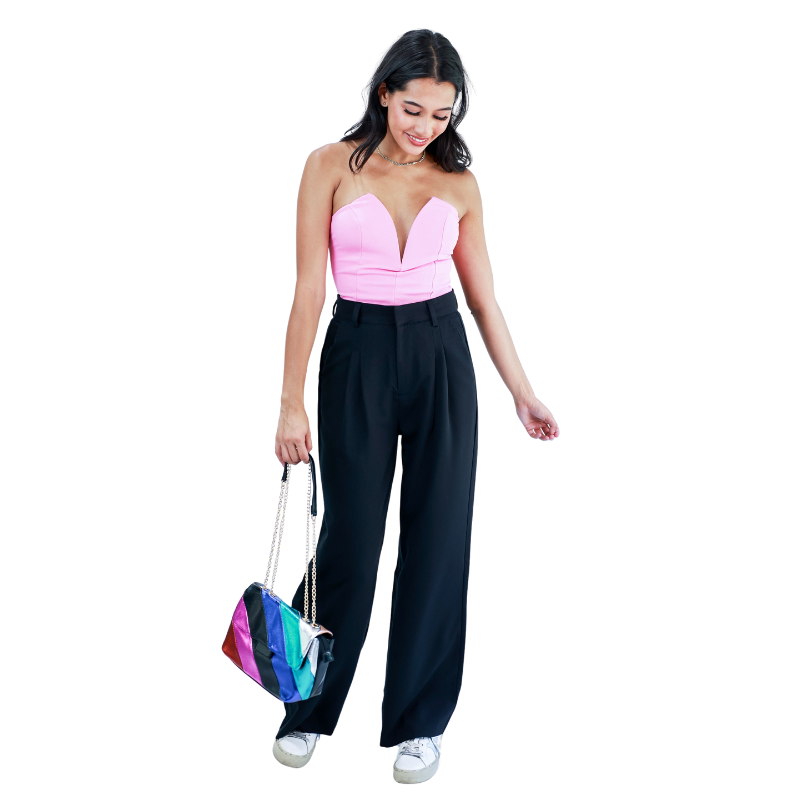 The chic pink bodysuit brings a touch of sophistication to any outfit. The subtle yet eye-catching color elevates the overall look while maintaining a refined and modern appeal. Whether worn solo or combined with neutral tones, this shade enhances the outfit's elegance.
