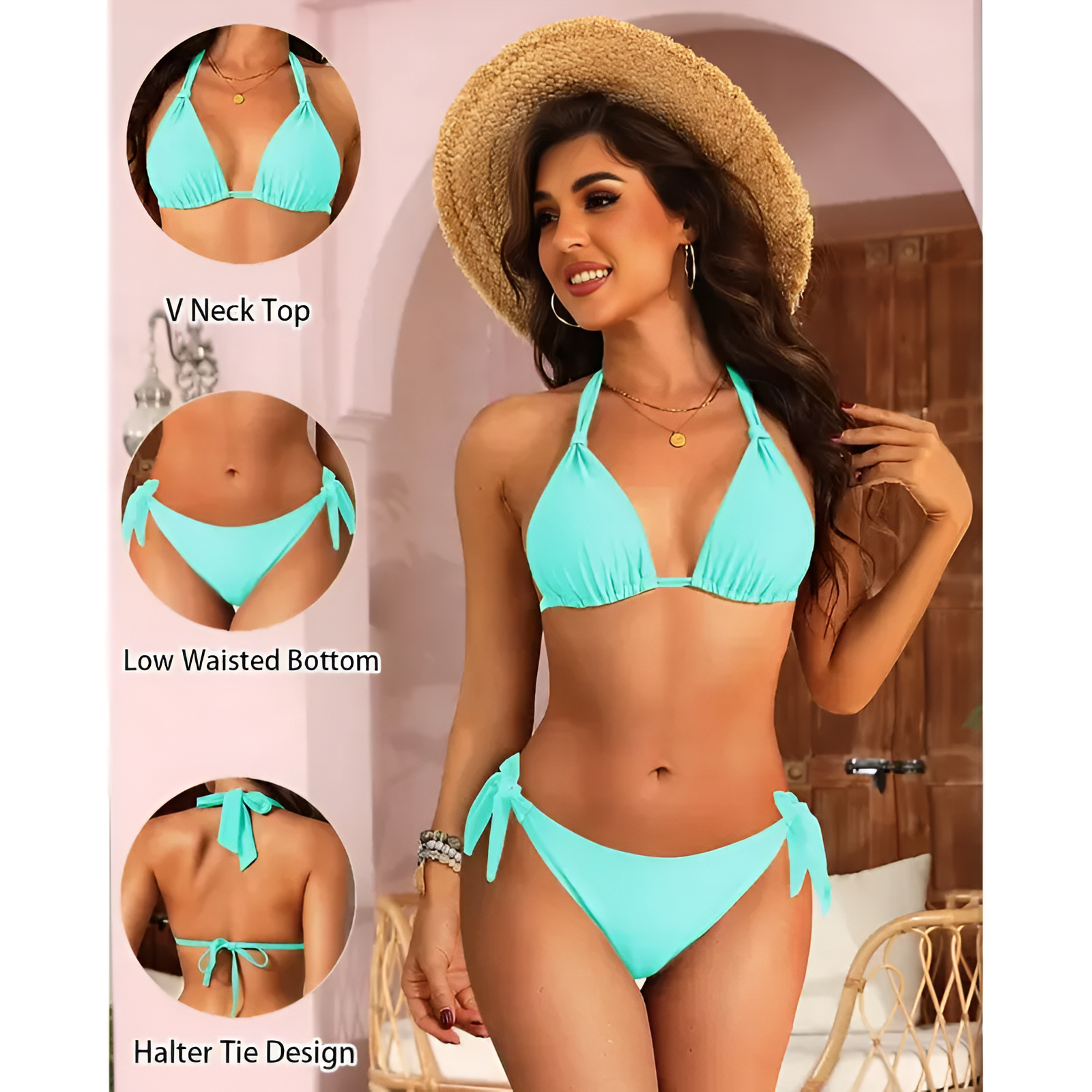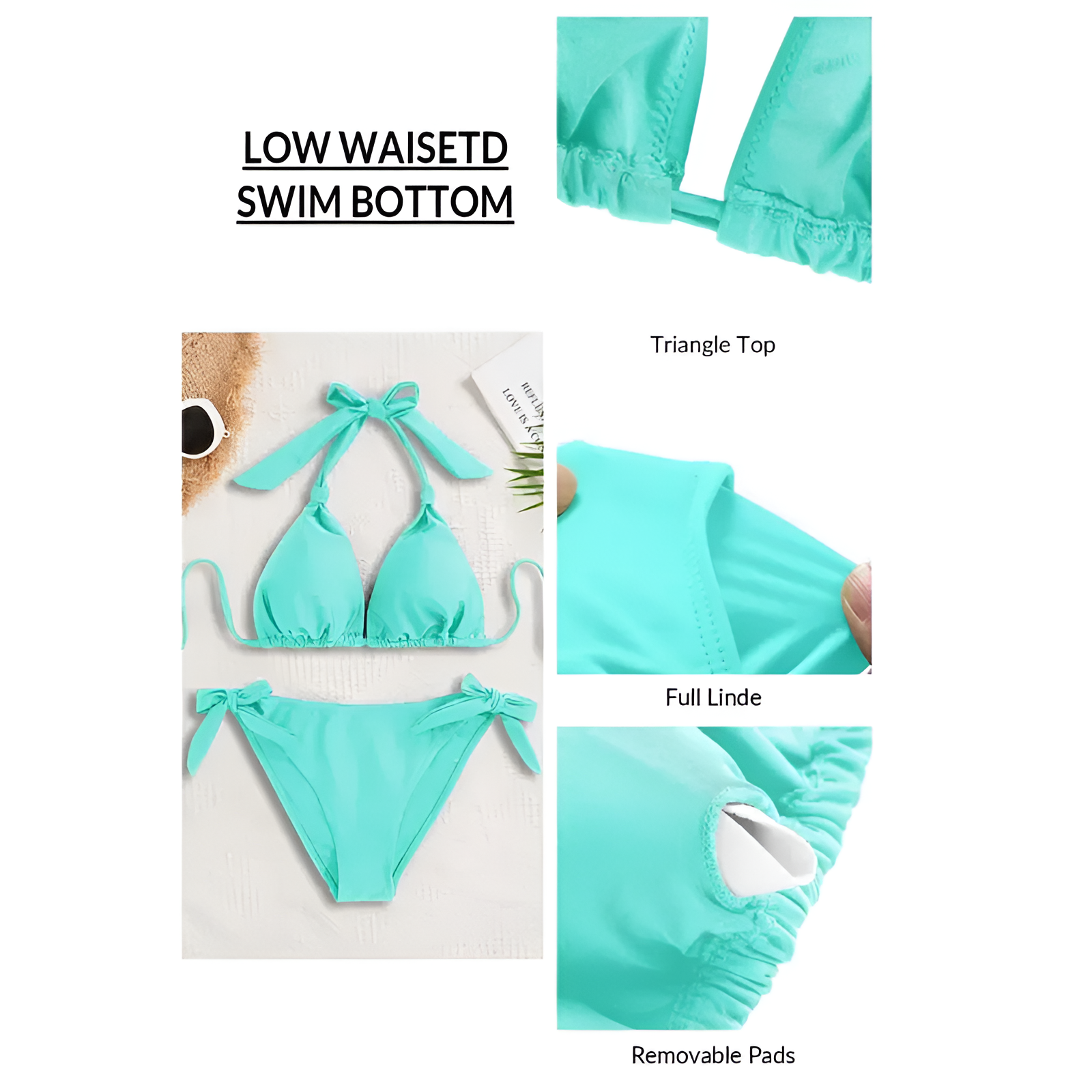 • The triangle cup structure creates a balanced silhouette. The halter tie strap allows adjustable lift and positioning. The back tie closure supports further customization.Removable padding gives flexibility in shaping. The fabric remains lightweight during water use.