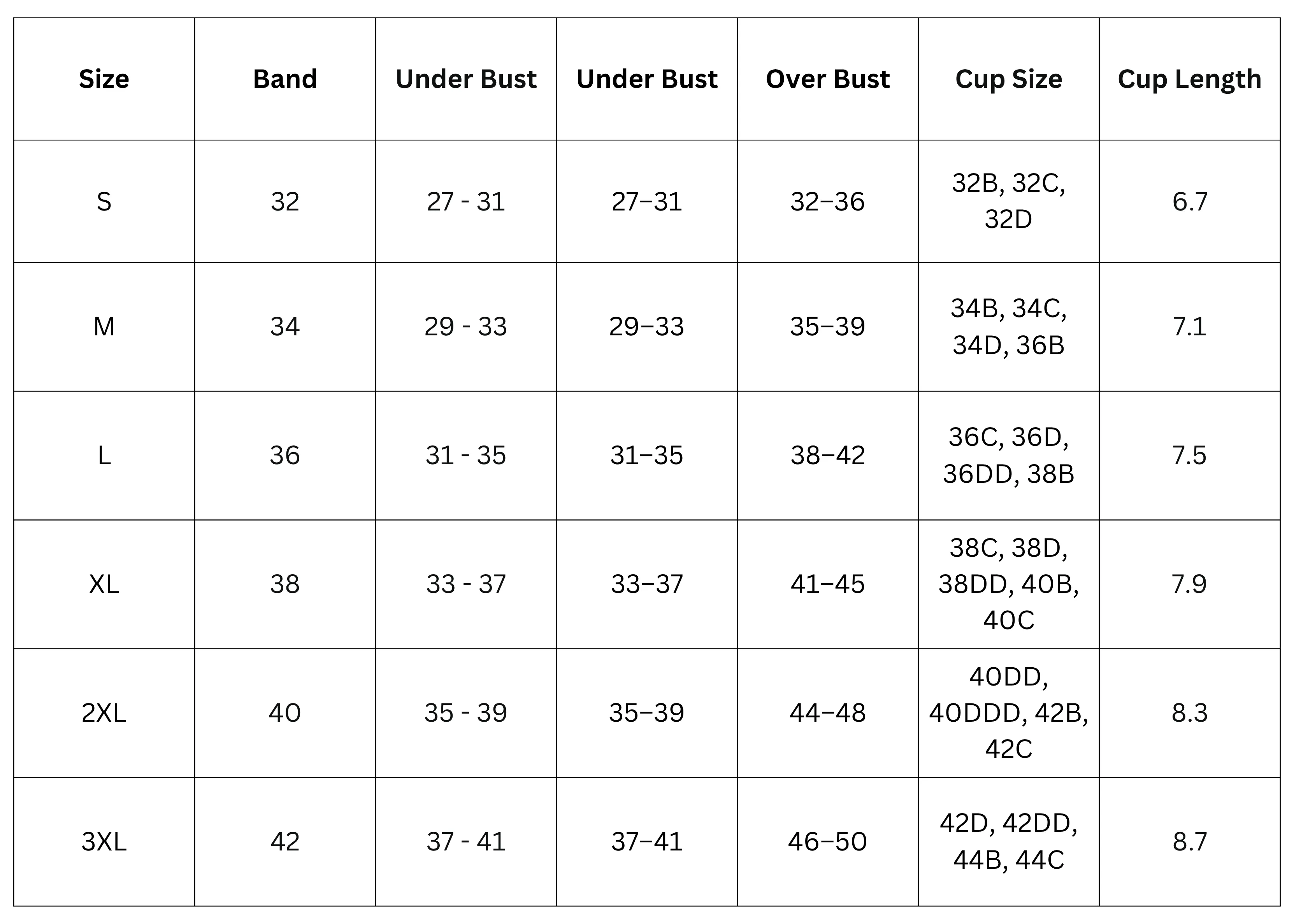 Size Chart (inches):