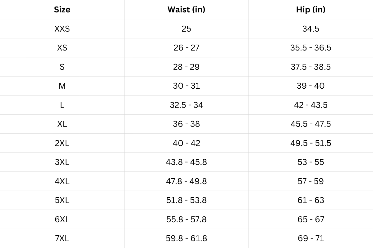 Size Chart (inches):
