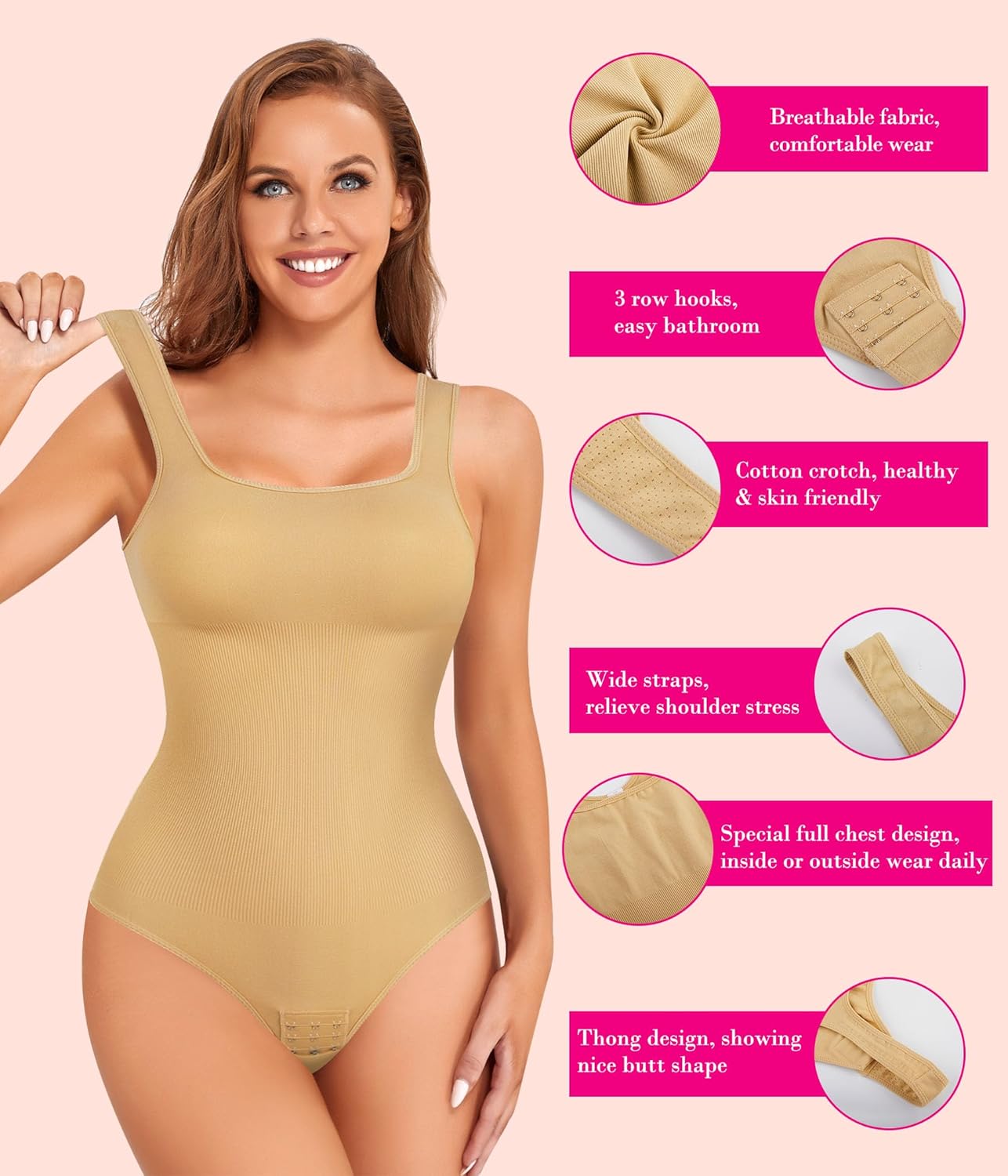 The bodysuit features an adjustable closure shapewear with a three-row hook design. This allows you to customize the fit for maximum comfort and support. The adjustable hooks provide a secure, personalized fit that stays in place throughout the day.
