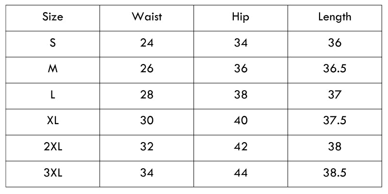 Size Chart (inches):